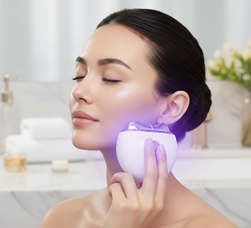 Zachte microstroomimpulsen activeren de gezichtsspieren, terwijl paars licht (470 nm) de teint egaliseert en celvernieuwing stimuleert.